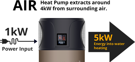 Heat pumps utilise an ingenious technology to efficiently transfer thermal energy directly from the surrounding air and into the water, and so do not rely on direct sun or fossil fuels to provide an energy source.